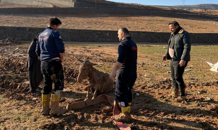 Şırnak’ın Cizre ilçesinde, Cumhuriyet Mahallesi Bozalan TOKİ Konutları mevkiinde yağışların ardından çamurlaşan arazide iki eşek bataklığa saplandı.