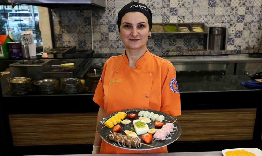 Hazırlanan çöp şiş katmerler portakallı, limonlu, çilekli ve sütlü çikolatalı seçeneklerle servis ediliyor; rengarenk çikolatalarla sunulan ürünün Adanalılardan ilgi gördüğü aktarıldı.