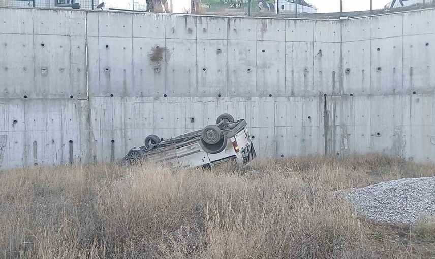 Çorum'da hafif ticari araç istinat duvarından sahaya düştü