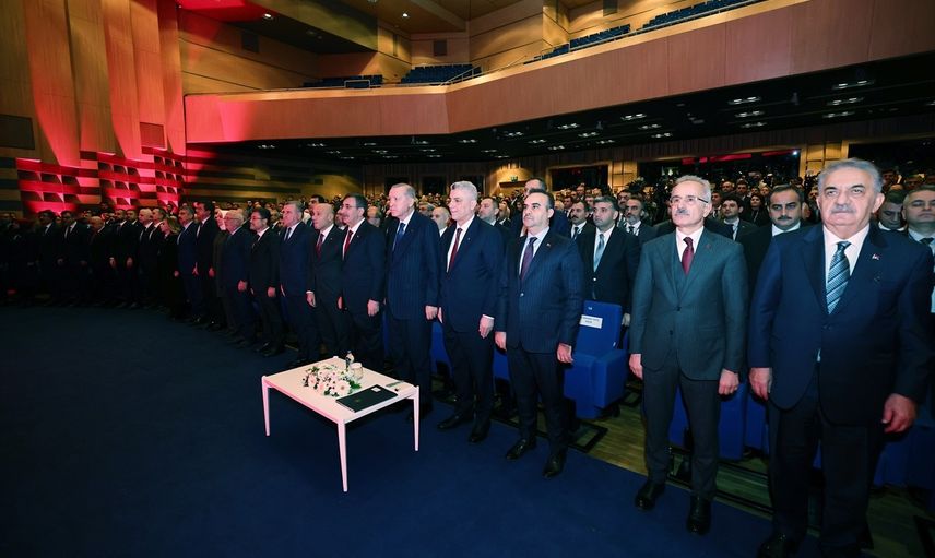 Cumhurbaşkanı Recep Tayyip Erdoğan, Ticaret Bakanlığı ve Türkiye İhracatçılar Meclisi (TİM) işbirliği ile Haliç Kongre Merkezi'nde gerçekleştirilen 2024 yılı dış ticaret rakamlarının açıklandığı programa katıldı. Programda Cumhurbaşkanı Yardımcısı Cevdet Yılmaz (sağ 5), Sanayi ve Teknoloji Bakanı Mehmet Fatih Kacır (sağ 2), Ulaştırma ve Altyapı Bakanı Abdulkadir Uraloğlu (sağda), Gençlik ve Spor Bakanı Osman Aşkın Bak (sağ 7), Adalet Bakanı Yılmaz Tunç (sağ 8) Ticaret Bakanı Ömer Bolat (sağ 3) de yer aldı.