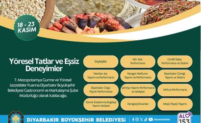 Diyarbakır Büyükşehir Belediyesi, 18-23 Kasım tarihlerinde düzenlenen 7. Mezopotamya Gurme Fuarında kentin mutfak mirasını ziyaretçilere aktaracak. Kültür ve Sosyal İşler Dairesi Başkanlığı tarafından hazırlanan çeşitli etkinliklerle belediyenin standında şefler, gastronomi uzmanları, akademisyenler ve araştırmacılar programlar sunacak.
