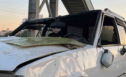 Hatay'ın Defne ilçesi Çekmece Mahallesinde seyir halindeyken üst geçidin merdivenine çarpan Tofaş marka, 31 AVB 084 plakalı otomobil takla atarak ters döndü.