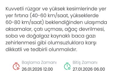 Yapılan açıklamaya göre 26 Ocak Pazartesi 12.00 ile 27 Ocak Salı sabah 06.00 arasında bölgedeki rüzgârın kuvvetli eseceği öngörülüyor. Yüksek kesimlerde saatlik hızların 40-60 km/saat, daha yüksek yerlerde ise 60-80 km/saat dolaylarında olabileceği belirtildi.
