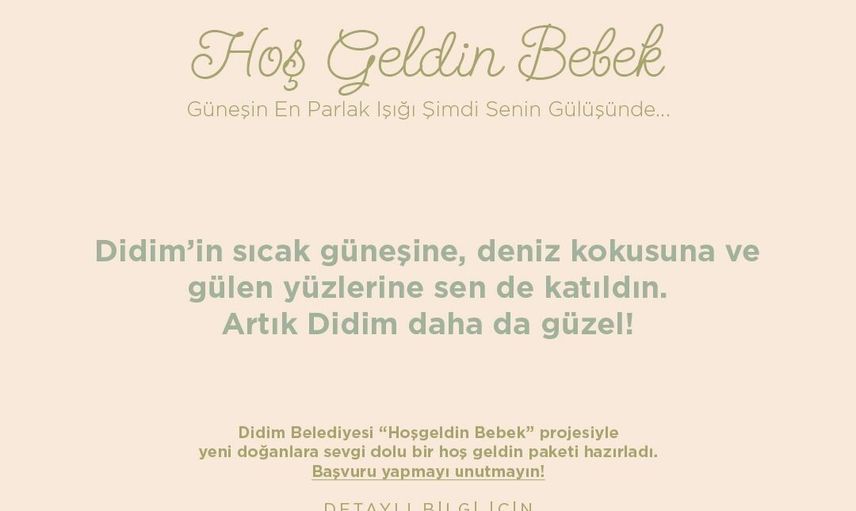 Didim Belediye Başkanı Hatice Gençay konuyla ilgili yaptığı açıklamada, "Didim’de doğan her bebekle birlikte umutlarımız tazeleniyor, kentimizin neşesi artıyor. Yeni hayatların ilk adımlarına tanıklık etmekten büyük mutluluk duyuyoruz. Ailelerimizin yanında olmak ve bebeklerimize sevgi dolu hediyelerimizle 'hoş geldin' demek bizim için çok kıymetli" dedi.