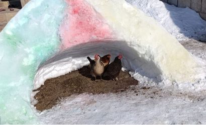 Özenle kazılan kar tünelleri ve kulübe biçimindeki barınakların içinde tavuklar ile bir kedi güvenli şekilde korunuyor. Barınakların tabanına serilen saman ile zeminden gelen soğuğun etkisi azaltıldı ve hayvanların konforu gözetildi.