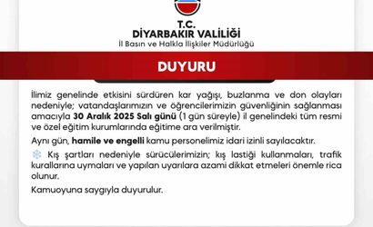Diyarbakır Valiliği, kent genelinde etkili olan kar yağışı ve buzlanma nedeniyle eğitim öğretime ara verildiğini bildirdi.