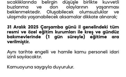 Diyarbakır Valiliğinden yapılan açıklamada, ‘’Meteorolojik verilere göre 31 Aralık Çarşamba günü sabah saatlerinden itibaren ilimiz genelinde kuvvetli ve yer yer yoğun kar yağışlarının etkili olması, hava sıcaklıklarında belirgin düşüşle birlikte kuvvetli buzlanma ve don olaylarının yaşanması beklenmektedir. Oluşabilecek olumsuzluklar ve yaşanabilecek aksamalar dikkate alınarak, 31 Aralık Çarşamba günü il genelindeki tüm resmi ve özel eğitim kurumları ile kreş ve gündüz bakımevlerinde 1 gün süreyle eğitime ara verilmiştir. Aynı tarihte engelli ve hamile kamu personeli idari izinli sayılacaktır’’ denildi.