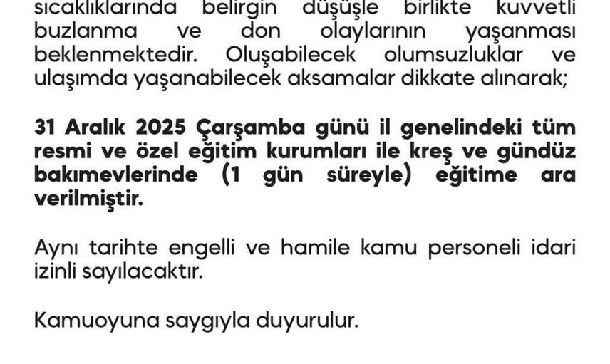 Karar kapsamında il genelindeki tüm resmi ve özel eğitim kurumları ile kreş ve gündüz bakımevlerinde 1 gün süreyle eğitime ara verilmiş; engelli ve hamile kamu personeli aynı tarihte idari izinli sayılacaktır.
