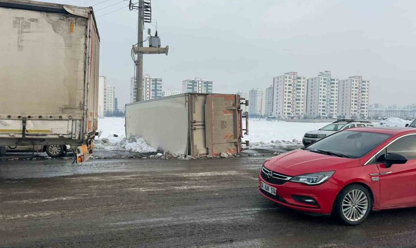 Diyarbakır'ın merkez Kayapınar ilçesinin Talaytepe Mahallesi Sultan Sasa Bulvarı'nda seyir halindeyken, yolun kayganlaşması nedeniyle bir tır devrildi. Sürücü direksiyon hakimiyetini kaybedince araç devrilerek kaza meydana geldi.