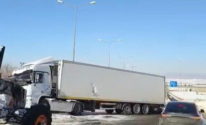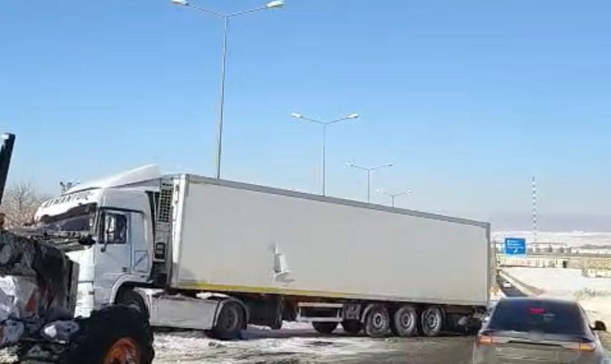 Kar yağışı sonrası yol yüzeyinde oluşan buzlanma nedeniyle sürücünün direksiyon hakimiyetini kaybettiği bir tır yoldan çıktı.