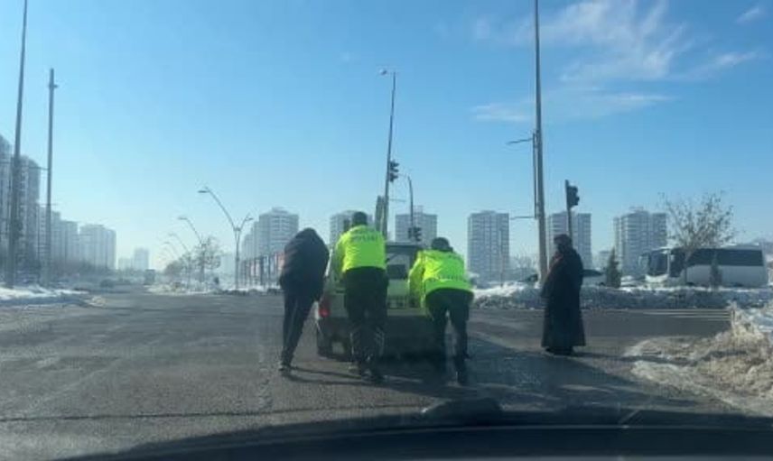 Polislerin bu anları, bölgede bulunan bir kişinin cep telefonu kamerasıyla kayda geçti. Görüntülerde ekiplerin soğuk hava koşullarında sürücüye destek verdiği ve aracın tekrar harekete geçirilmesine katkıda bulunduğu görülüyor.