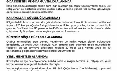 Yılbaşının huzur içinde geçirilmesi amacıyla emniyet, jandarma, gıda-tarım, sağlık, afet, karayolları ve göç teşkilatları başta olmak üzere tüm birimlerde kapsamlı tedbirler alındı. Tedbirlerin 30 Aralık 2025 - 2 Ocak 2026 tarihleri arasında kesintisiz uygulanacağı bildirildi. Alışveriş merkezleri, pazarlar, ana cadde ve meydanlar ile kamu kurumları, ibadethaneler, toplu etkinlik alanları ve konaklama tesislerinde sıkı denetimler gerçekleştirilecektir. Trafik kazalarını önlemek ve şehir içi ulaşımı düzenlemek amacıyla trafik ekipleri nüfus ve araç yoğunluğunun fazla olduğu bölgelerde kontrollerini artıracaktır. Ayrıca hırsızlık, kapkaç ve dolandırıcılık gibi asayiş olaylarına karşı önleyici tedbirler ve günübirlik kiralanan evler ile konaklama tesislerinde kapsamlı kontroller planlanmıştır.