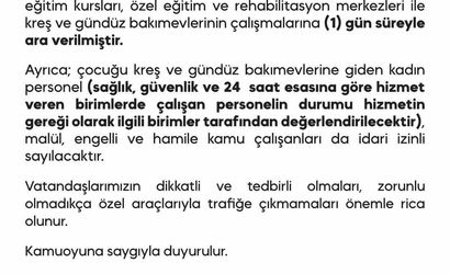 Ayrıca, çocuğu kreş ve gündüz bakımevlerine giden kadın personel, malül, engelli ve hamile kamu çalışanları aynı gün idari izinli sayılacak.