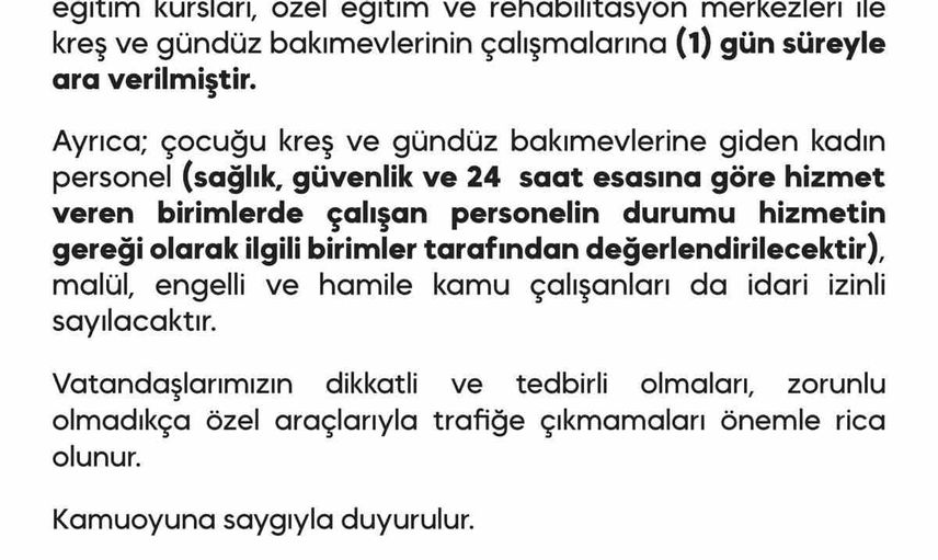 Valilik açıklamasına göre, il genelinde etkili olan yoğun kar yağışı ve bunun ulaşımda yol açabileceği aksaklıklar dikkate alınarak 23 Ocak 2026 Cuma günü bazı eğitim ve bakım hizmetlerine ara verildi.