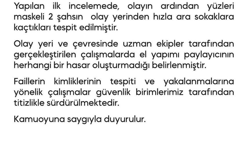 Diyarbakır Emniyet Müdürlüğü tarafından yapılan açıklamada, "25 Ocak 2026 günü saat 20.15 sıralarında İl Emniyet Müdürlüğümüz ana hizmet binasının vatandaş girişinin bulunduğu yola el yapımı patlayıcı atılmıştır. Yapılan ilk incelemede, olayın ardından yüzleri maskeli 2 şahsın olay yerinden hızla ara sokaklara kaçtıkları tespit edilmiştir. Olay yeri ve çevresinde uzman ekipler tarafından gerçekleştirilen çalışmalarda el yapımı patlayıcının herhangi bir hasar oluşturmadığı belirlenmiştir. Faillerin kimliklerinin tespiti ve yakalanmalarına yönelik çalışmalar güvenlik birimlerimiz tarafından titizlikle sürdürülmektedir." denildi.