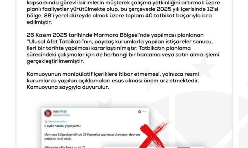 Bazı basın yayın organları ve sosyal medya hesaplarında ‘Büyük Marmara Depremi Tatbikatı, İçişleri Bakanlığı tarafından iptal edildi ve hazırlıklar için harcanan milyonlarca lira boşa gitti’ şeklinde dolaşıma sokulan iddialar asılsız olup, dezenformasyon niteliği taşımaktadır. AFAD Başkanlığı tarafından TAMP kapsamında görevli birimlerin müşterek çalışma yetkinliğini artırmak üzere planlı faaliyetler yürütülmekte olup, bu çerçevede 2025 yılı içerisinde 12’si bölge, 28’i yerel düzeyde olmak üzere toplam 40 tatbikat başarıyla icra edilmiştir. 26 Kasım 2025 tarihinde Marmara Bölgesi’nde yapılması planlanan ‘Ulusal Afet Tatbikatı’nın paydaş kurumlarla yapılan istişareler sonucu ileri bir tarihte yapılması kararlaştırılmıştır. Tatbikatın planlama sürecindeki çalışmalar için de herhangi bir harcama veya satın alma işlemi gerçekleştirilmemiştir. Kamuoyunun manipülatif içeriklere itibar etmemesi, yalnızca resmi kurumlarca yapılan açıklamaları esas alması önem arz etmektedir.