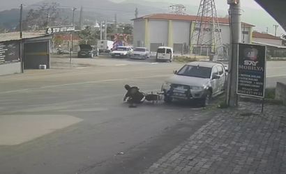 HATAY'DA GÜVENLİK KAMERASINA YANSIYAN KAZADA CİPLE ÇARPIŞAN MOTOSİKLETİN SÜRÜCÜSÜ METRELERCE SAVRULDU.