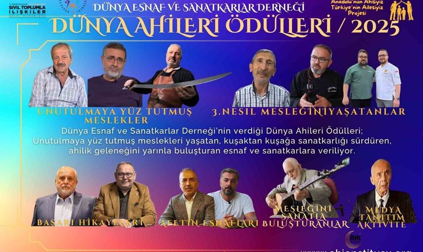 Dünya Esnaf ve Sanatkarlar Derneği-Ahi Enstitüsü tarafından gelenekselleşen Dünya Ahileri Ödülleri, 2025 yılında 6 ana kategoride toplam 12 esnaf ve sanatkara takdim edildi. İçişleri Bakanlığı Sivil Toplumla İlişkiler Genel Müdürlüğü desteğiyle yürütülen "Anadolu’nun Ahisiyiz, Türkiye’nin Ailesiyiz" projesi kapsamında verilen ödüller, esnaf kültürünü ve dayanışmasını öne çıkardı.