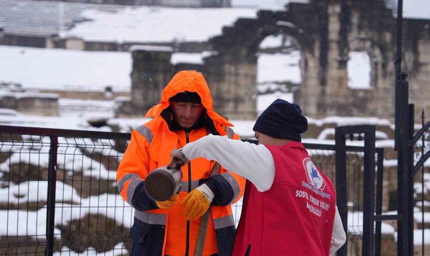 Ulaşımın aksamasını önlemek ve vatandaşların mağduriyet yaşamaması için yoğun mesai yapan ekipler, soğuk hava ve kar yağışı altında görevlerini sürdürürken sunulan ikram sayesinde kısa bir mola verip içlerini ısıttı.