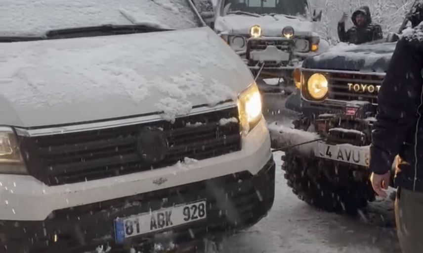 DÜZCE’DE YAYLAYA KAR SAFARİSİ YAPMAYA GİDEN DÜZCE SAFARİ OFFROAD KULÜBÜ ÜYELERİ, SAMANDERE ŞELALESİ MEVKİİNDE ŞARAMPOLE KAYAN BÖLGE HALKININ MİNİBÜSÜNÜ VİNÇLERLE KURTARDI.