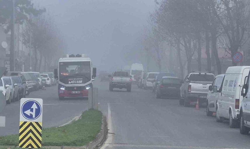 DÜZCE (İHA) - Kış mevsiminin etkisiyle kentte yoğun sis görüldü. Sis bazı noktalarda görüş mesafesini 30 metreye kadar düşürürken, gece saatlerinde bu mesafe 10 metreye kadar geriledi.