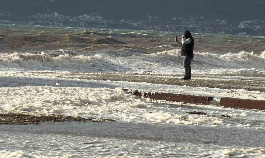 Balıkesir'in Edremit ilçesinde dün akşam saatlerinden itibaren etkili olan lodos, Altınkum Plajında sıradışı bir doğa olayına neden oldu. Fırtınanın etkisiyle denizde oluşan dev dalgalar kıyıya vurdukça yoğun bir köpük tabakası ortaya çıktı.