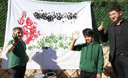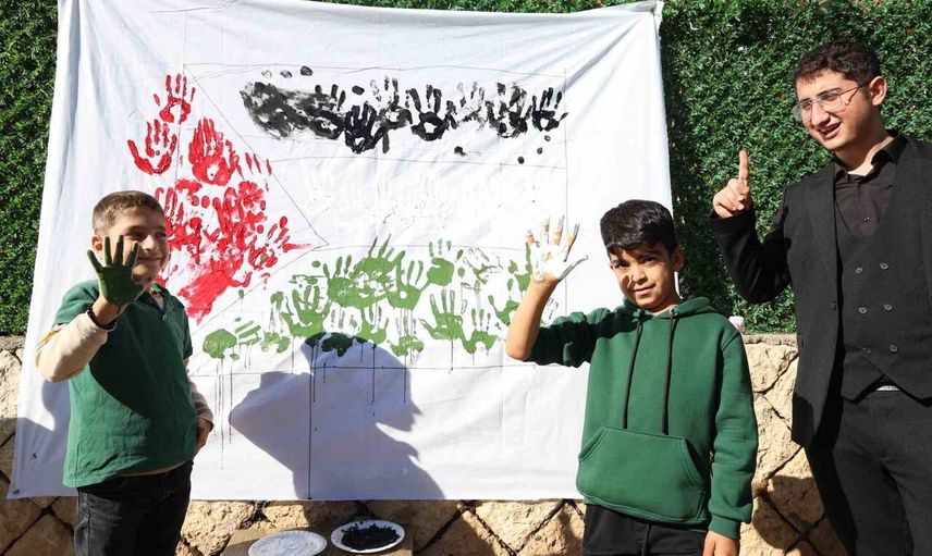 Etkinlik kapsamında öğrenciler, kırmızı, siyah ve yeşile boyadıkları parmak ve ellerini kumaştan hazırlanan panoya bastı; ortaya Filistin bayrağını simgeleyen bir çalışma çıktı.
