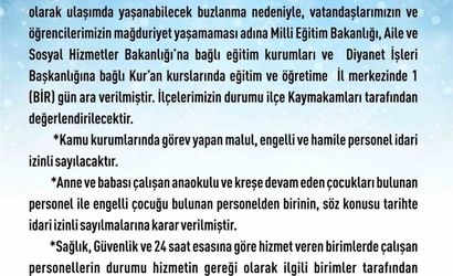 Açıklamada, il merkezinde Milli Eğitim Bakanlığı, Aile ve Sosyal Hizmetler Bakanlığına bağlı eğitim kurumları ile Diyanet İşleri Başkanlığı'na bağlı Kur’an kurslarının söz konusu tarihte eğitime ara vereceği belirtildi. İlçelerdeki uygulamanın ise ilçe kaymakamlıkları tarafından değerlendirileceği ifade edildi.