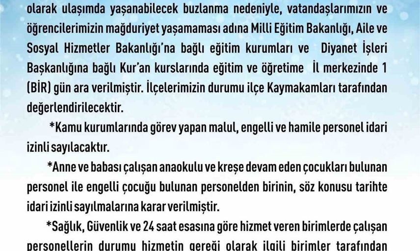 Valilikten kar yağışı ve buzlanma gerekçesiyle alınan karar