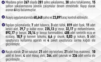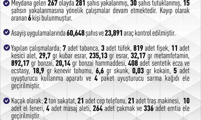 Yapılan operasyonlarda ele geçirilenler arasında 7 tabanca, 3 tüfek ve 819 fişek, ayrıca 11 kesici alet yer aldı. Uyuşturucu miktarları ise şöyle bildirildi: 29,7 gram kubar esrar, 235,13 gram esrar, 32,17 gram metamfetamin, 892,17 gram bonzai, 20,14 gram bonzai hammaddesi, 408 adet sentetik ecza ve ecstasy, 18,9 gram kenevir tohumu, 6,6 gram skunk, 0,03 gram kokain, 5 uyuşturucu kullanma aparatı ile 4 paket uyuşturucu sarma kağıdı.