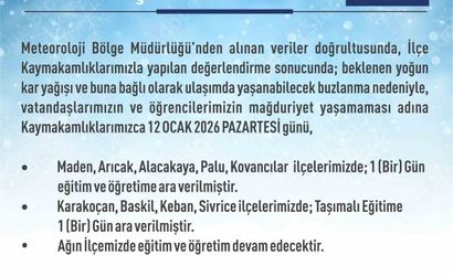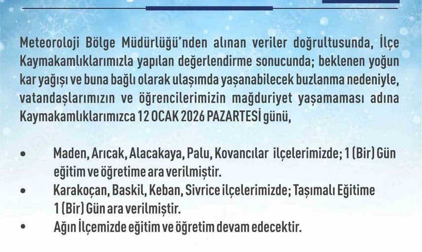 Açıklamada ayrıca Karakoçan, Baskil, Keban, Sivrice ilçelerinde taşımalı eğitime ara verildiği, Ağın ilçesinde ise eğitim-öğretim faaliyetlerinin devam edeceği belirtildi.