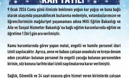 Açıklamada, Milli Eğitim Bakanlığı ve Aile ve Sosyal Hizmetler Bakanlığı'na bağlı eğitim kurumlarında eğitim ve öğretime 1 gün süreyle ara verildiği belirtildi. Kamu kurumlarında görev yapan malul, engelli ve hamile personel idari izinli sayılacak.