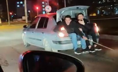 Öndeki aracın bagaj kapağına oturan 2 kişi, ellerine aldıkları bir iple arızalı Doğan'ı arkadan çekti. Uygulama hem kendileri hem de trafikteki diğer sürücüler için tehlike oluşturdu.