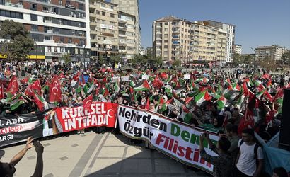 El-Aksa Platformu ve çeşitli sivil toplum kuruluşlarının öncülüğünde İzzet Paşa Camisi önünde bir araya gelen kalabalık, ellerinde Filistin bayrakları ve pankartlarla Gazi Caddesi’nden Cumhuriyet Meydanı’na yürüdü.