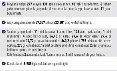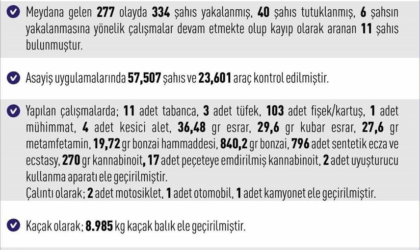 Diğer bulgular: Çalıntı olarak 2 adet motosiklet, 1 adet otomobil ve 1 adet kamyonet ele geçirilmiş; kaçak olarak 8 bin 985 kilo kaçak balık yakalanmıştır.