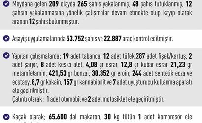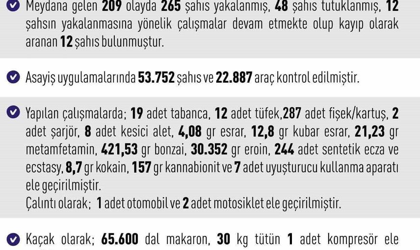 Çalışmalarda ele geçirilenler arasında 19 adet tabanca, 12 adet tüfek, 287 adet fişek/kartuş, 2 adet şarjör, 8 adet kesici alet, 4,08 gram esrar, 12,8 gram kubar esrar, 21,23 gram metamfetamin, 421,53 gram bonzai, 30 kilo 352 gram eroin, 244 adet sentetik ecza ve ecstasy, 8,7 gram kokain, 157 gram kannabionit ve 7 adet uyuşturucu kullanma aparatı yer aldı. Ayrıca çalıntı olarak 1 otomobil ve 2 motosiklet, kaçak olarak ise 65 bin 600 dal makaron, 30 kilo tütün ve 1 kompresör ele geçirildi.