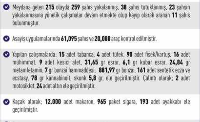Operasyonlarda ele geçirilenler arasında 15 tabanca, 4 tüfek, 90 fişek/kartuş, 16 mühimmat ve 9 kesici alet bulunuyor. Uyuşturucu maddelere ilişkin ele geçirmeler: 31,65 gram esrar, 6,1 gram kubar esrar, 24,84 gram metamfetamin, 7 gram bonzai hammaddesi, 881,97 gram bonzai, 161 adet sentetik ecza ve ecstasy, 78 gram kannabinoit ve 5,8 gram skunk.