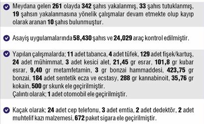 Denetim faaliyetleri kapsamında 58.420 şahıs ve 24.029 araç kontrol edilmiş; kontrol edilen araçlardan 3.324 adedine cezai işlem uygulanmış ve 158 araç trafikten men edilmiştir.