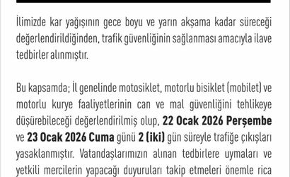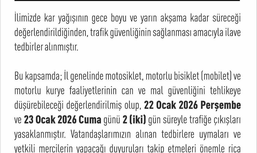 Elazığ Valiliği'nden yapılan açıklamada, "İlimizde kar yağışının gece boyu ve yarın akşama kadar süreceği değerlendirildiğinden, trafik güvenliğinin sağlanması amacıyla ilave tedbirler alınmıştır. Bu kapsamda; İl genelinde motosiklet, motorlu bisiklet (mobilet) ve motorlu kurye faaliyetlerinin can ve mal güvenliğini tehlikeye düşürebileceği değerlendirilmiş olup, 22 Ocak 2026 Perşembe ve 23 Ocak 2026 Cuma günü 2 (iki) gün süreyle trafiğe çıkışları yasaklanmıştır. Vatandaşlarımızın alınan tedbirlere uymaları ve yetkili mercilerin yapacağı duyuruları takip etmeleri önemle rica olunur" denildi.