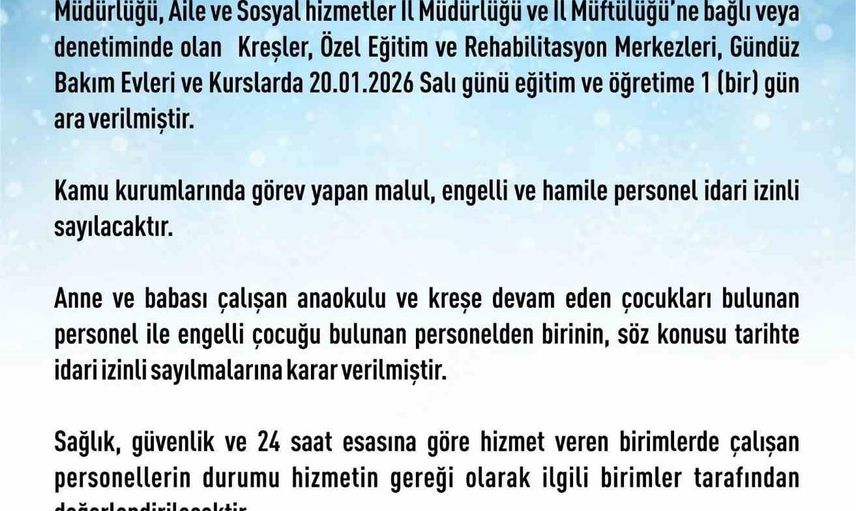 Elazığ Valiliği tarafından yapılan açıklamada, il merkezinde kreşler, özel eğitim ve rehabilitasyon merkezleri, gündüz bakım evleri ve kursların salı günü eğitim ve öğretime bir gün ara vereceği belirtildi.