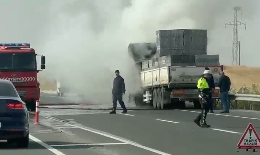 Elazığ — Elazığ-Malatya karayolunda seyir halindeyken kabininde alevler yükselen tuğla yüklü tır, sürücünün aracı kenara çekmesiyle durduruldu.