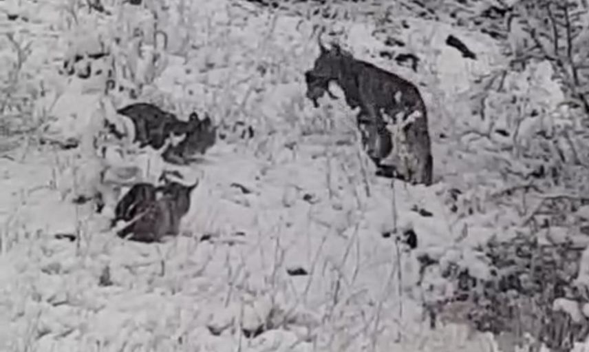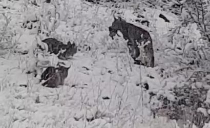 Dünya Doğa ve Doğal Kaynakları Koruma Birliği’nin (IUCN) nesli tükenme tehlikesi altında olan türlerin yer aldığı kırmızı listesinde bulunan bir anne vaşak ve 2 yavrusu, Karakoçan ilçesi Balcalı köyü kırsalında kar üzerinde yakaladıkları kekliği yerken görüntülendi.