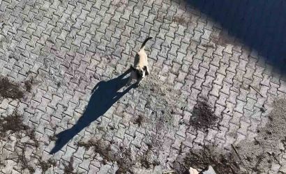Dronun hareketlerini dikkatle takip eden köpek, hava aracı hızlandığında peşinden koşarak onu yakalamaya çalıştı. Köpeğin dronu yakalama çabası, izleyenlere neşeli ve renkli anlar sundu.