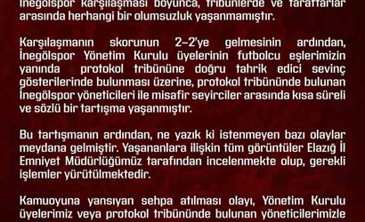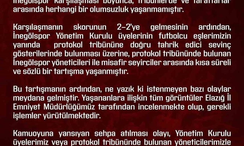 Elazığspor Kulübü, evinde oynanan ve 4-2’lik galibiyetle sonuçlanan İnegölspor maçında protokol tribününde meydana gelen gelişmelere ilişkin bir açıklama yayımladı.