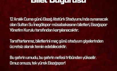 Seza Çimento Elazığspor'un Kepezspor karşısında aldığı 6-0'lık galibiyetin ardından şampiyonluk umutları yeniden canlanırken, yönetim de 12 Aralık Cuma günü Elazığ Atatürk Stadyumu'nda oynanacak Sultan Su İnegölspor müsabakasının biletlerini üstleneceğini duyurdu.