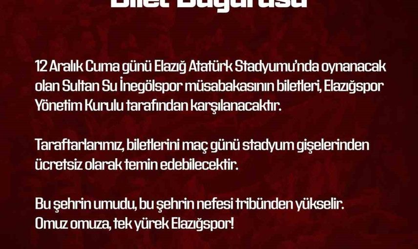 Elazığspor Yönetim Kurulu, İnegölspor karşılaşması için taraftarların stada erişimini kolaylaştırmak amacıyla maç biletlerini ücretsiz hale getirdi.