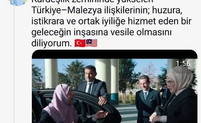 Emine Erdoğan paylaşımında şu ifadeyi kullandı: "Kardeşlik zemininde yükselen Türkiye-Malezya ilişkilerinin huzura, istikrara ve ortak iyiliğe hizmet eden bir geleceğin inşasına vesile olmasını diliyorum".