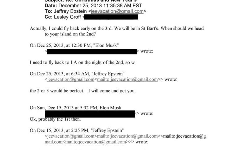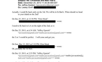 Başka bir e-posta dizisinde ise iş insanı Elon Musk ile Epstein arasındaki yazışmalar yer aldı. 13 Aralık 2013 tarihli bir e-postada Musk, Epstein’e "Tatilde İngiltere Virjin Adaları yakınlarında Saint Barthelemy Adası’nda olacağım. Ne zaman müsait olursun?" diye yazdı. Epstein iki gün sonra yanıtlayarak "Senin için her zaman yerimiz var" dedi. Yazışmaların devamında Musk’ın Epstein’e "Ayın 2’sinde adaya ne zaman gidelim?" diye sorduğu belgelerde yer aldı.