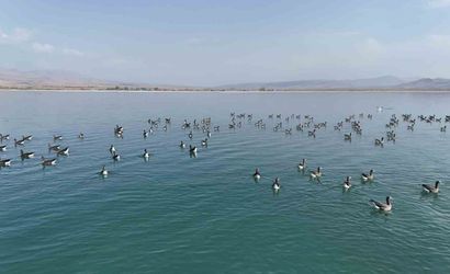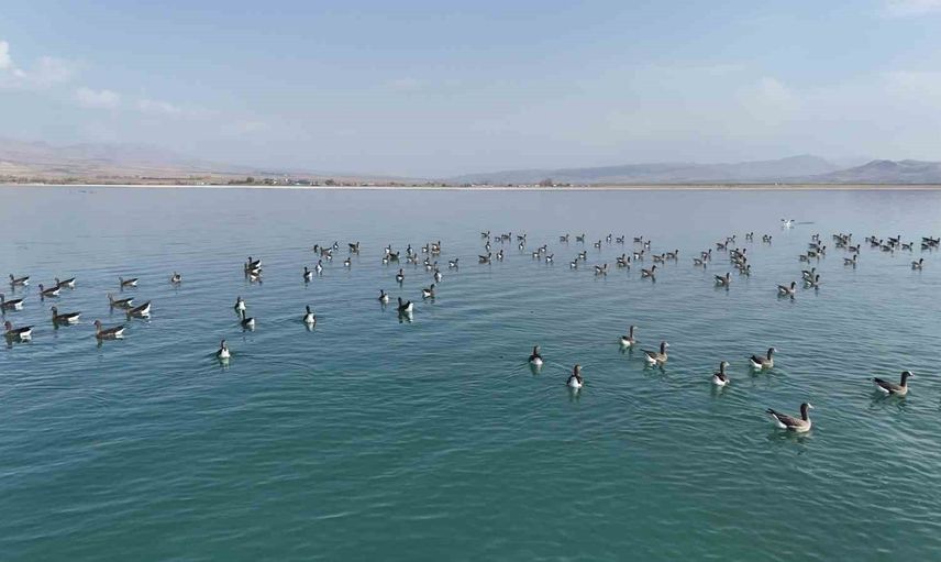 Göl ve çevresinde konaklayan yüzlerce küçük sakarca kazı, dron ile net biçimde görüntülendi. Zarif duruşları ve toplu hareketleri, Erçek Gölü'ne görsel bir canlılık kattı.
