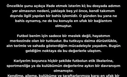 Oyuncu ayrıca kariyeri boyunca futbolun etik ilkelerine, sportmenliğe ve kulübünün değerlerine aykırı bir davranışta bulunmadığını, kendisine, ailesine, kulübüne ve taraftarlara karşı mahcup olmamak için daima şeffaf davrandığını ve aynı duruşu sürdüreceğini ifade etti.